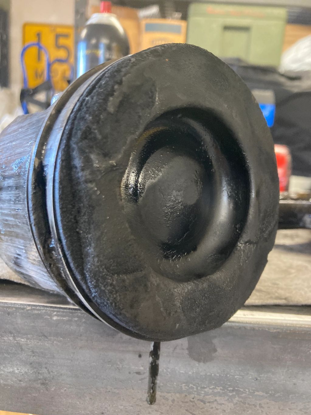 This is a set of 6.4 pistons that have been delipped, fly cut and milled .010. Delipping the pistons on this particular engine, reduces the stress riser on the original design piston and helps prevent cracking and also lowers the compression a bit since the 6.4 has a tendency to run high boost pressures all the time. The fly cut is to make the 6.4 a zero interference engine. The valves can not kiss the pistons in the case of an overspeed. This particular engine we had to have the block decked, so we had the pistons milled .010 off the top to keep the piston height within Ford specificationsh